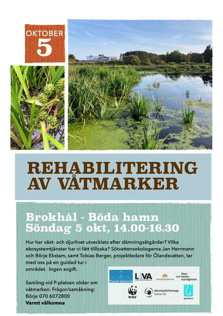 Välkommen att delta på en spännande exkursion vid Brokhål våtmark (vid Böda hamn), en av flera platser på norra Öland där Sportfiskarna har genomfört rehabiliteringsåtgärder. Ölands Vattenråd var med och finansierade anläggandet och inventeringar av växt- och djurliv i området innan restaureringarna genomfördes och nu har inventeringar genomförts några år efter åtgärderna. Du kan läsa mer om resultatet från projektet här.